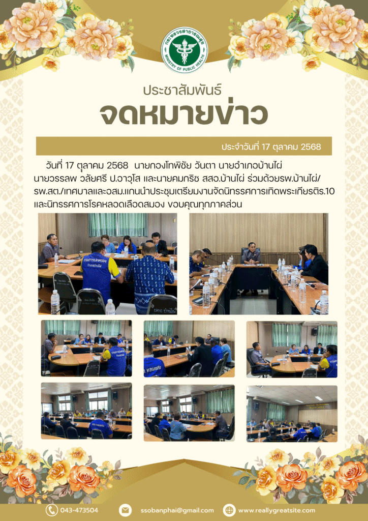วันที่ 17 ตุุลาคม 2568 นายกองโทพิชัย วันตา นายอำเภอบ้านไผ่ นายวรรลพ วลัยศรี ป.อาวุโส และนายคมกริช สสอ.บ้านไผ่ ร่วมด้วยรพ.บ้านไผ่/รพ.สต./เทศบาลและอสม.แกนนำประชุมเตรียมงานจัดนิทรรศการเทิดพระเกียรติร.10 และนิทรรศการโรคหลอดเลือดสมอง ขอบคุณทุกภาคส่วน