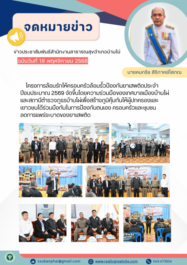 วันอังคารที่ 18 พฤศจิกายน 2568 นายเจษฎากร บัวแสง รองนายกเทศมนตรี เป็นประธานเปิดโครงการล้อมรักให้ครอบครัวล้อมรั้วป้องกันยาเสพติด ประจำปีงบประมาณ 2569 พร้อมด้วย พ.ต.อ. ปรัชญา มาศไชยสุระ ผู้กำกับสถานีตำรวจภูธรบ้านไผ่ โดยมี พ.ต.ต.ประสงค์ บรรเทา สวป.(ชส.) สภ.บ้านไผ่ เป็นผู้กล่าวรายงานวัตถุประสงค์ในการจัดโครงการฯ ในครั้งนี้ร่วมด้วยนายกองโทพิชัย วันตา นายอำเภอบ้านไผ่ นายคมกริช สิริภาคย์โสภณ สาธารณสุขอำเภอบ้านไผ่และนายสราวุธ เวชกูล หัวหน้าสำนักงานขนส่งจังหวัดขอนแก่น สาขาอำเภอบ้านไผ่ โดยมีอาสาสมัครสาธารณสุขประจำหมู่บ้าน (อสม.) จำนวน 140 คน เข้าร่วม ณ ห้องประชุม โรงเรียนบ้านเกิ้ง ตำบลบ้านไผ่ อำเภอบ้านไผ่ จังหวัดขอนแก่น