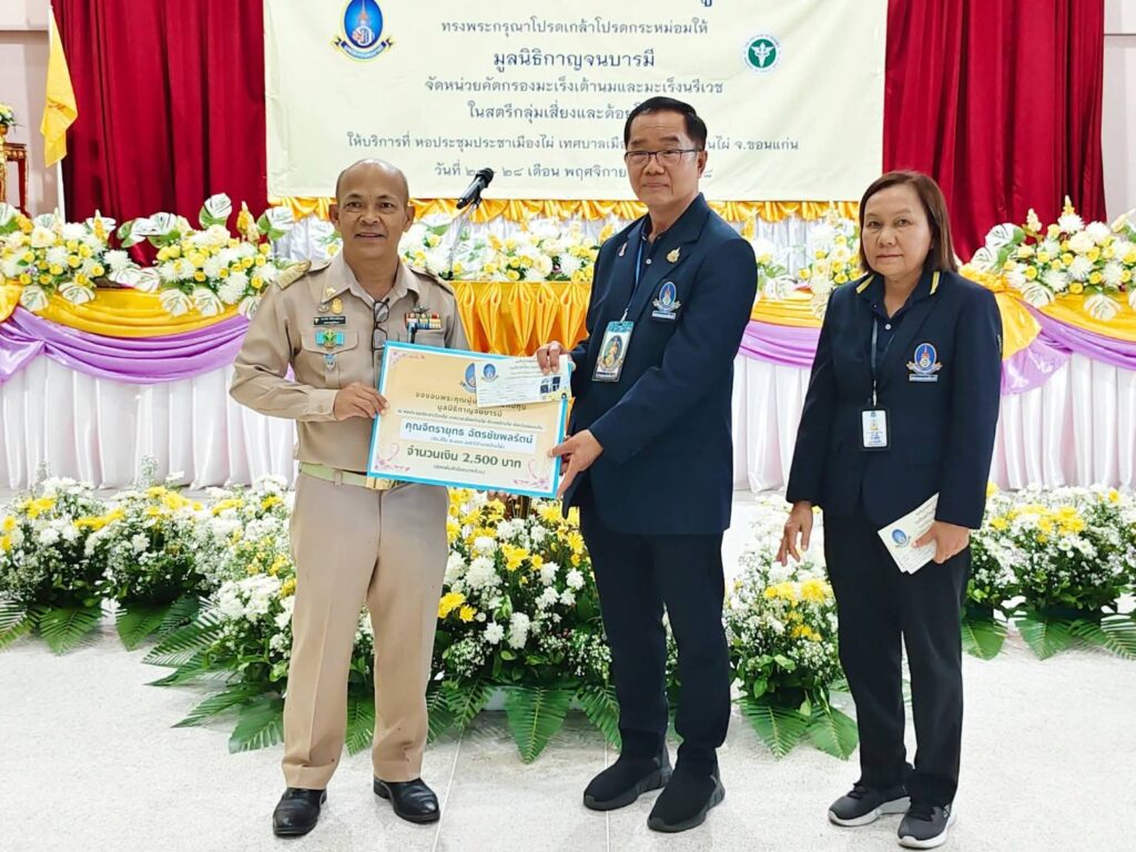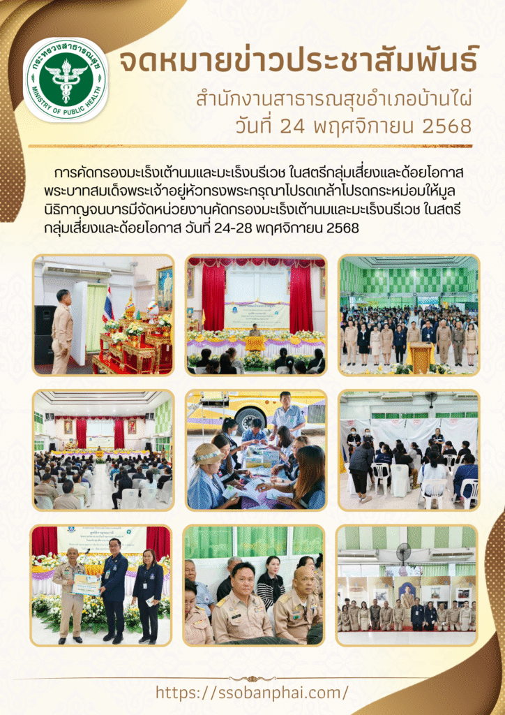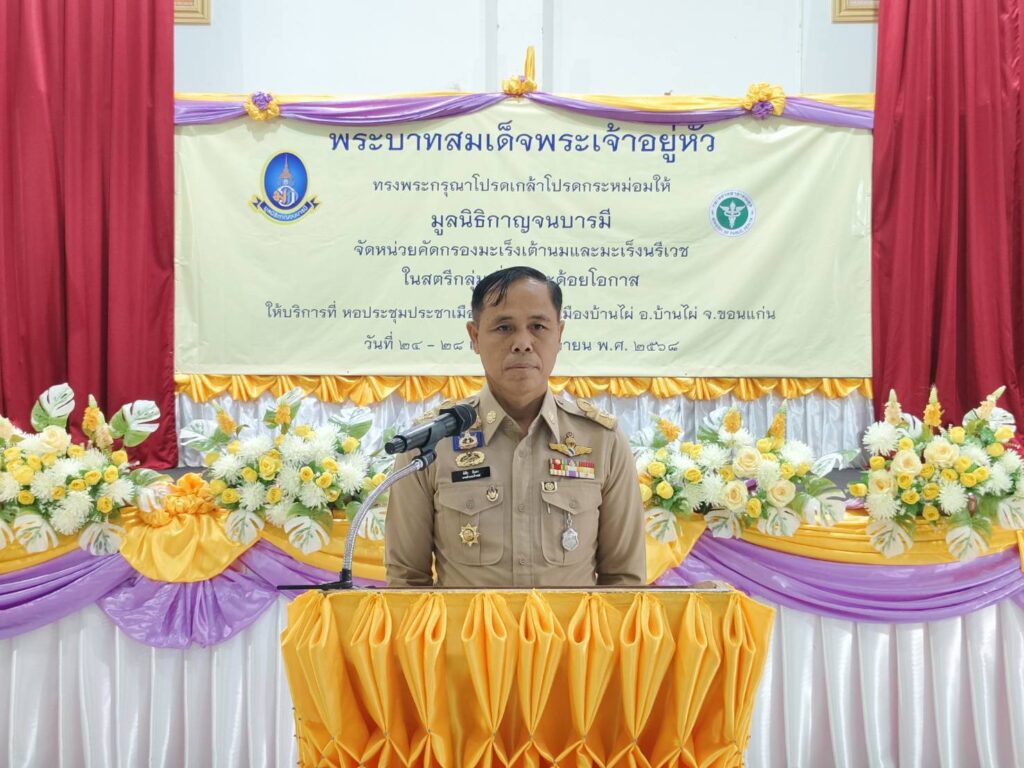 วันที่ 24 พฤศจิกายน 2568 นายคมกริช สิริภาคย์โสภณ สาธารณสุขอำเภอบ้านไผ่ ร่วมด้วยอสม.อำเภอบ้านไผ่และประชาชน ร่วมพิธีเปิดการคัดกรองมะเร็งเต้านมและมะเร็งนรีเวช ในสตรีกลุ่มเสี่ยงและด้อยโอกาส พระบาทสมเด็จพระเจ้าอยู่หัวทรงพระกรุณาโปรดเกล้าโปรดกระหม่อมให้มูลนิธิกาญจนบารมีจัดหน่วยงานคัดกรองมะเร็งเต้านมและมะเร็งนรีเวช ในสตรีกลุ่มเสี่ยงและด้อยโอกาส วันที่ 24-28 พฤศจิกายน 2568 รวมทั้งสิ้น 5 วัน  โดยมีนายกองโทพิชัย วันตา นายอำเภอบ้านไผ่  เป็นประธานในพิธีเปิด ณ หอประชุมประชาเมืองไผ่ เทศบาลเมืองบ้านไผ่