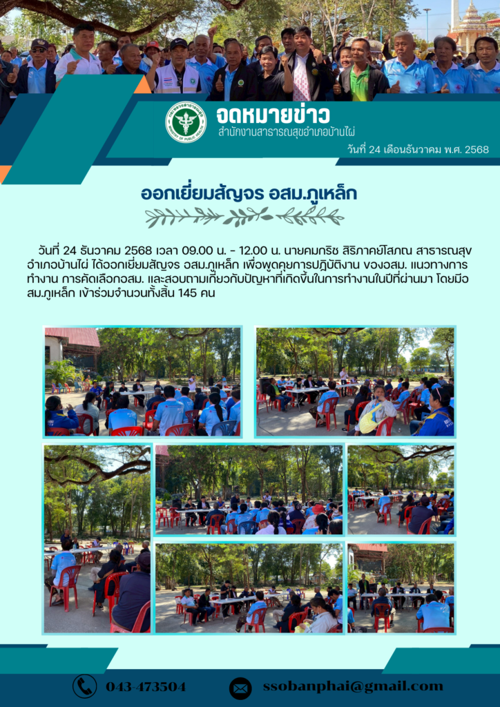 วันที่ 24 ธันวาคม 2568 เวลา 09.00 น. – 12.00 น. นายคมกริช สิริภาคย์โสภณ สาธารณสุขอำเภอบ้านไผ่ ได้ออกเยี่ยมสัญจร อสม.ภูเหล็ก เพื่อพูดคุยการปฏิบัติงาน ของอสม. แนวทางการทำงาน การคัดเลือกอสม. และสอบถามเกี่ยวกับปัญหาที่เกิดขึ้นในการทำงานในปีที่ผ่านมา โดยมีอสม.ภูเหล็ก เข้าร่วมจำนวนทั้งสิ้น 145 คน